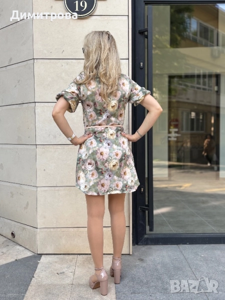 Дамска нова рокля риза, с панделка на врата, буфан ръкави и колан. Роклята е изработена от памучен сатен. Размер S-M
