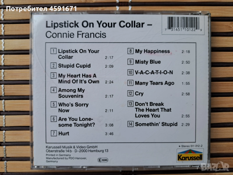 Connie Francis – Lipstick On Your Collar, снимка 1 - CD дискове - 52004994 Connie Francis – Lipstick On Your Collar, снимка 2 - CD дискове - 52004994 Connie Francis – Lipstick On Your Collar, снимка 3 - CD дискове - 52004994 1/3