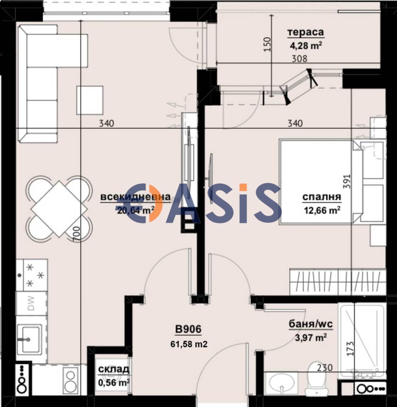 Обща площ: 61.58 кв. м.