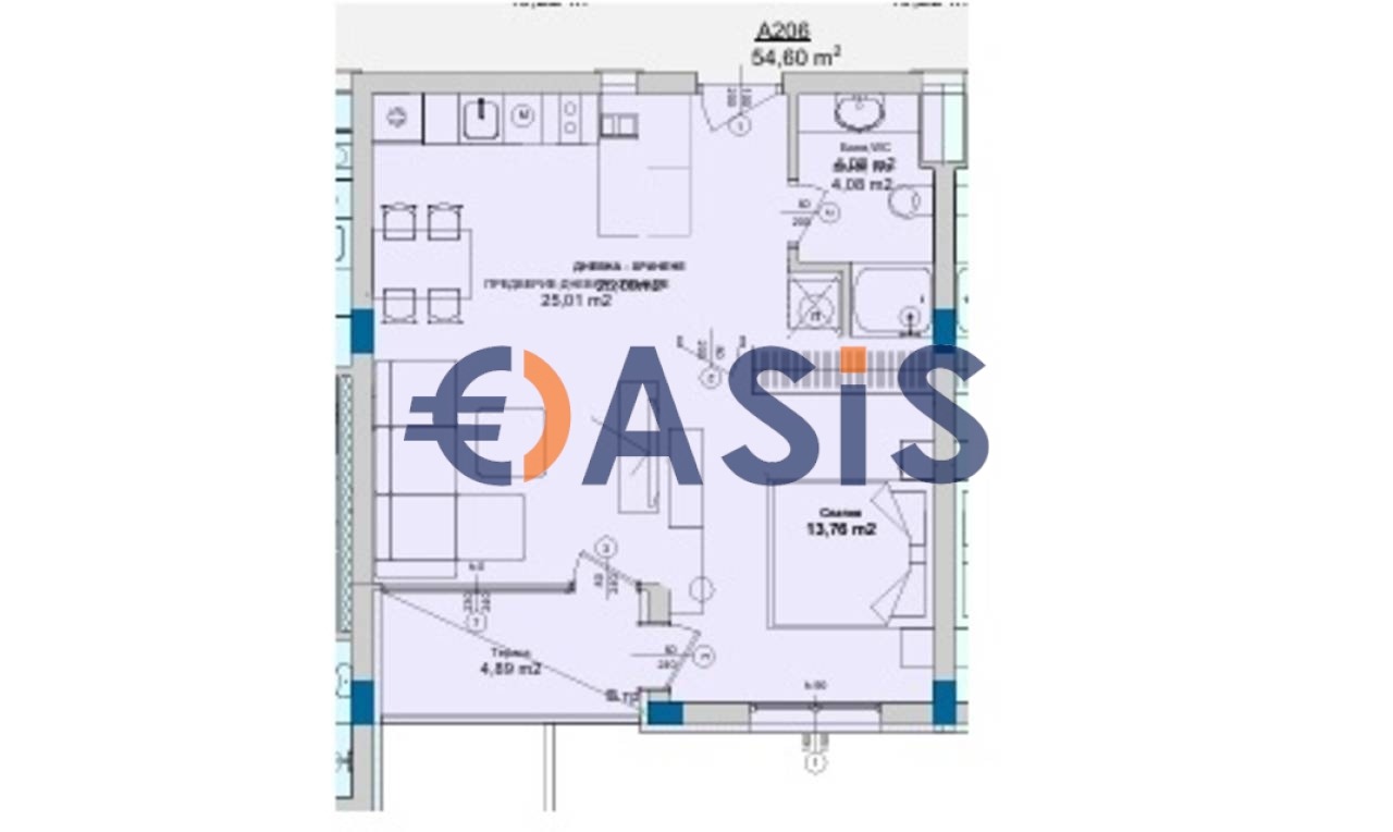 Обща площ: 64,34 кв. м. (застроена 54,6 кв. м.+общи части 9,74 кв. м.)