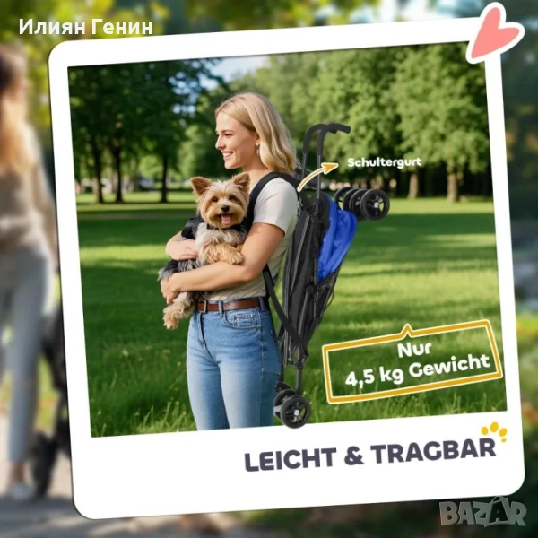Преносим дизайн: Леката количка за кучета тип чадър, тежаща само 4,5 кг, позволява лесно сгъване, носене и съхранение. Презрамката улеснява пренасянето на количката в парка или на разходка.