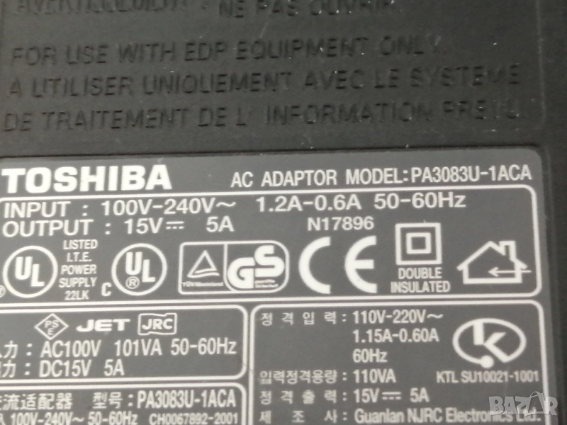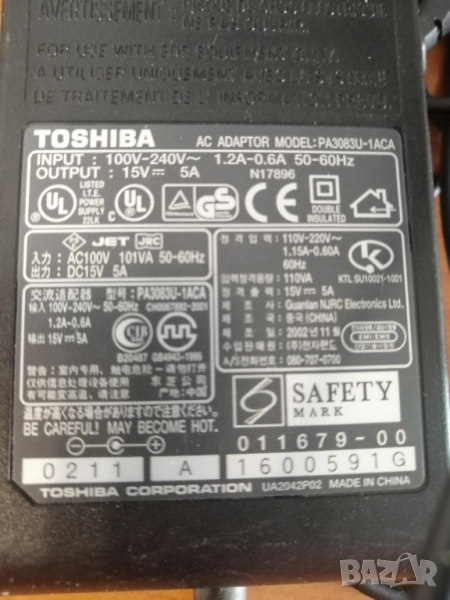 Оригинално зарядно за лаптоп TOSHIBA 15V, 5A → Обява 52005948