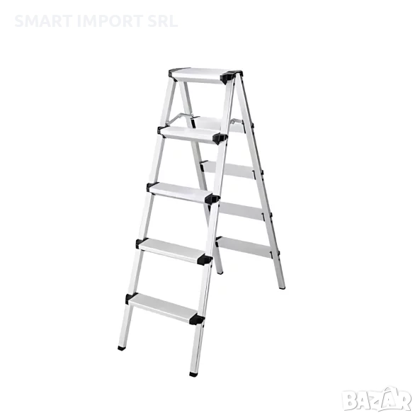 Четирите стъпала от всяка страна са широки и с противоплъзгащи улеи, осигуряващи стабилна и безопасна опора по време на работа. Каучуковите накрайници на краката повишават стабилността и предпазват повърхностите от надраскване. Стълбата се сгъва лесно за удобно транспортиране и компактно съхранение.