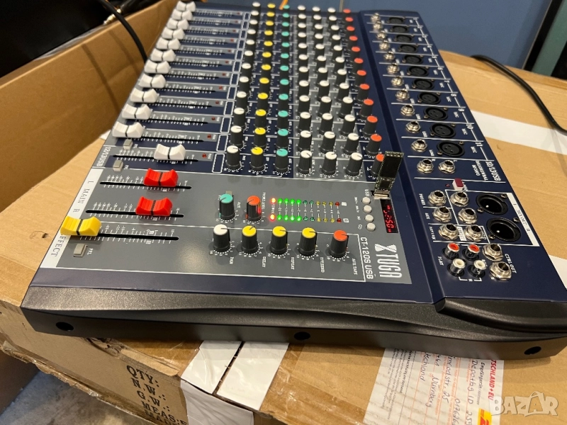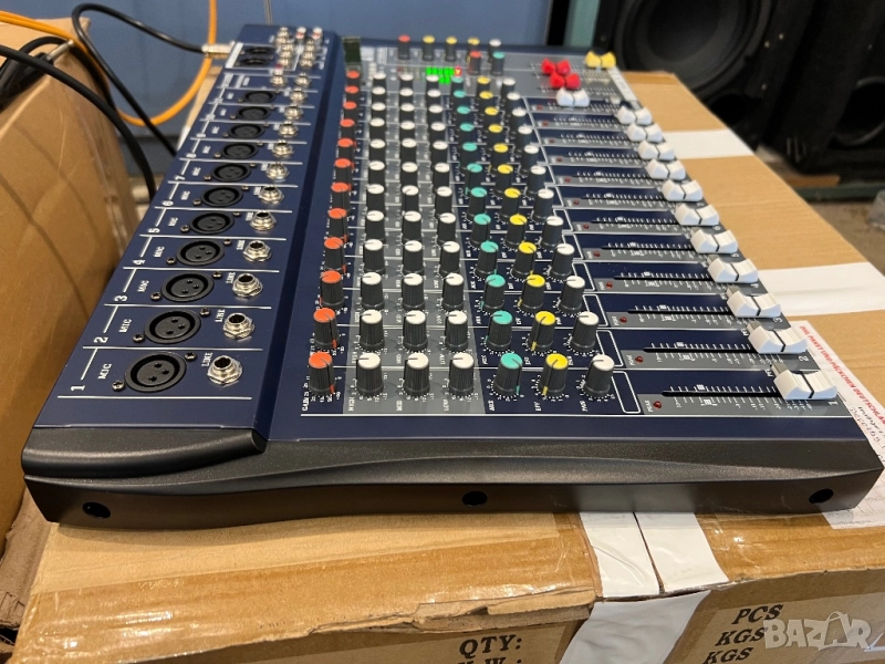 Микрофони: Свържете динамични или кондензаторни микрофони към XLR входовете. За кондензаторни микрофони, активирайте превключвателя за фантомно захранване 48V, разположен на главната секция на миксера.