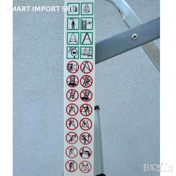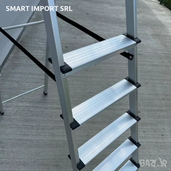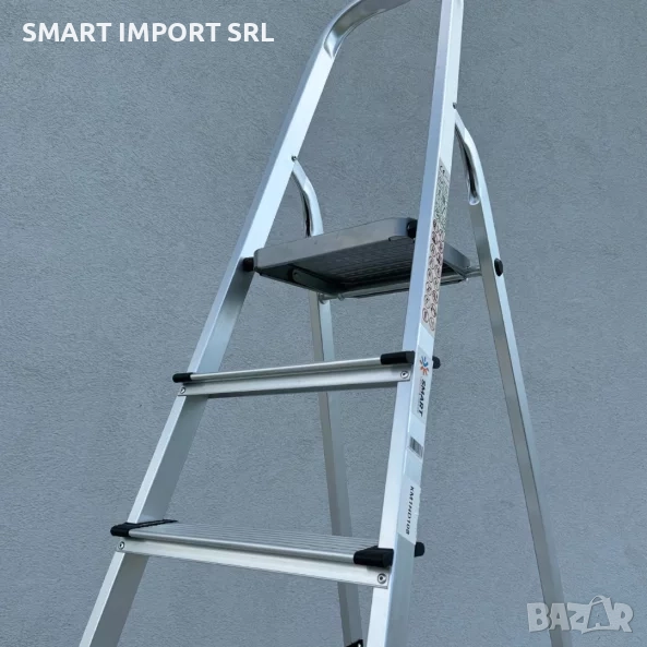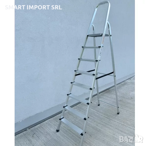 Осемте широки стъпала със специални противохлъзгащи канали осигуряват сигурно и стабилно изкачване. Каучуковите капачки в основата предпазват пода и предотвратяват случайно приплъзване. Горната извита дръжка предлага допълнителна опора, а здравата горна платформа позволява безопасна и удобна работа.