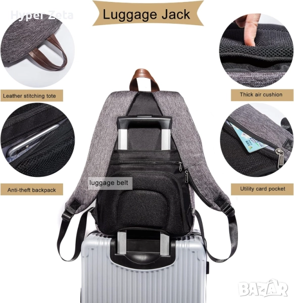 Здравите ремъци за куфар позволяват раницата лесно да се прикрепи към дръжката на пътния багаж, освобождавайки ръцете и гърба ти.