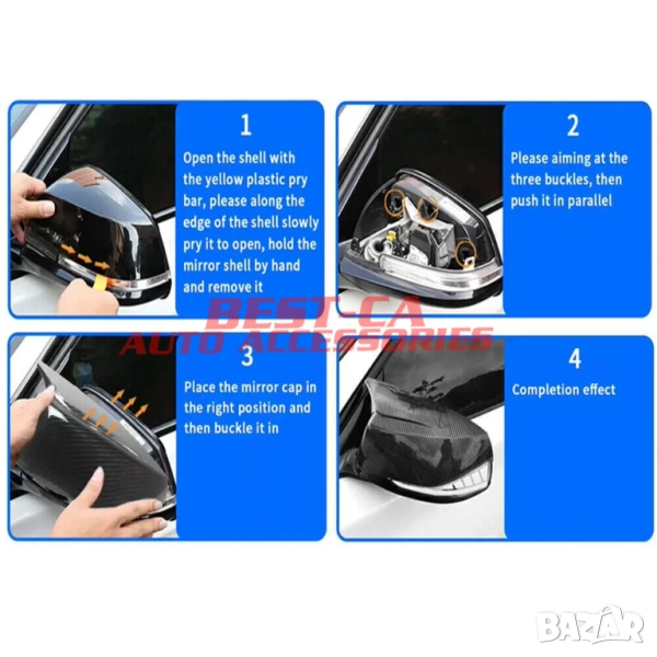 Пакета включва - два броя капаци за огледала (ляво+дясно) и инструмент за демонтаж на старите капаци.