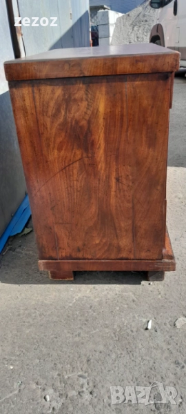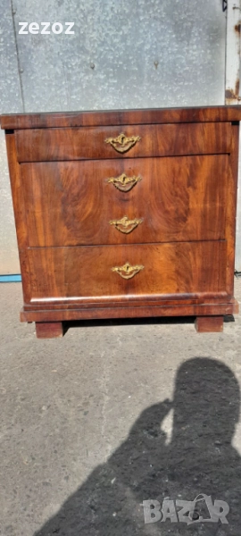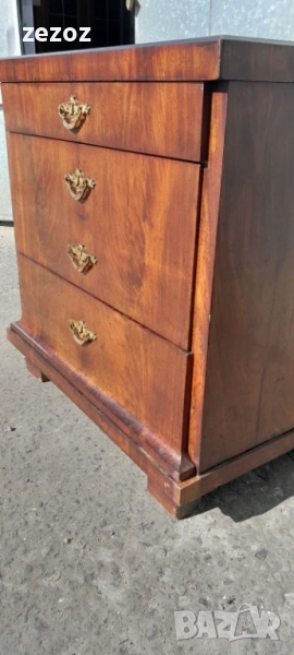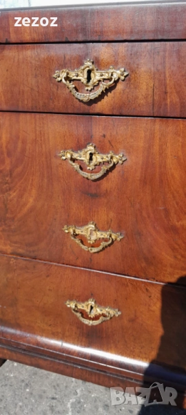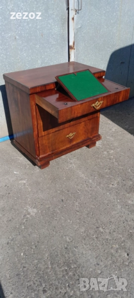 Едно рядко срещано антикварно писалище-около-1880-1890 г.Пълен масив покрит с махагонов фурнир.Горното чекмедже се превръща в плот за писане с две скрити отделения.Оригиналното покритие на плота.Месингов обков.Много добре запазен за възраста си.Габаритни размери-