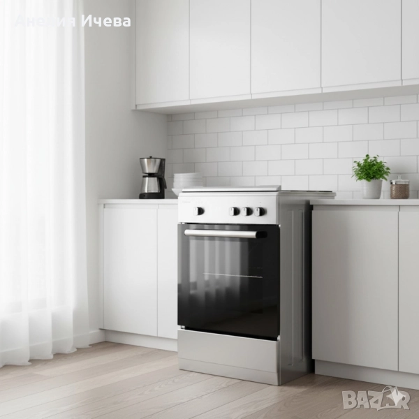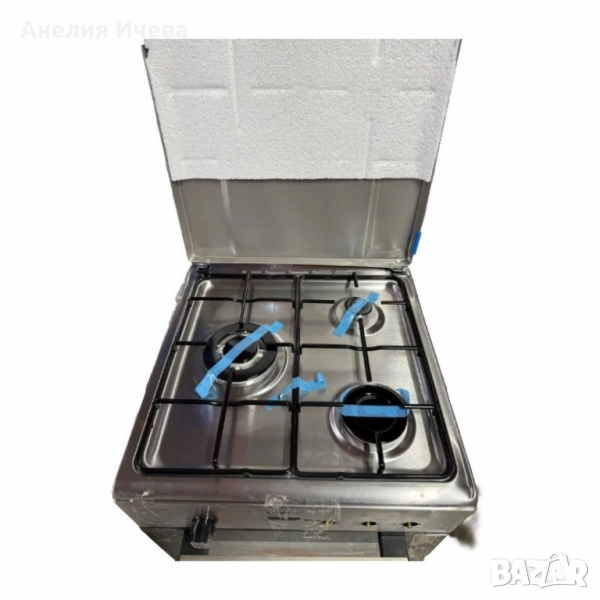 газова печка (3 котлона + газова фурна); Захранване: LPG – бутан G30 (30 mbar) / пропан G31 (37 mbar); Обща мощност: 9850 W; Фурна: Газова, 43 L, 2500 W, с долен горелка; Горелки: Wok – 3500 W; Бърза – 2900 W; Помощна – 950 W; Безопасност: Предпазни клапани за фурна и горелки; Материал: Неръждаема стомана (Inox); Врата: Двойно стъкло; Размери: 50 × 50 × 83 см; Аксесоари: 1× хромирана скара, 1× емайлирана тава; Капак: Метален; Крачета: Регулируеми; Дизайн: Inox с черен акцент; Дефекти: Липсват 3-те копчета отпред и 1-то краче е счупено - предно ляво; Гаранция: 12 месеца.