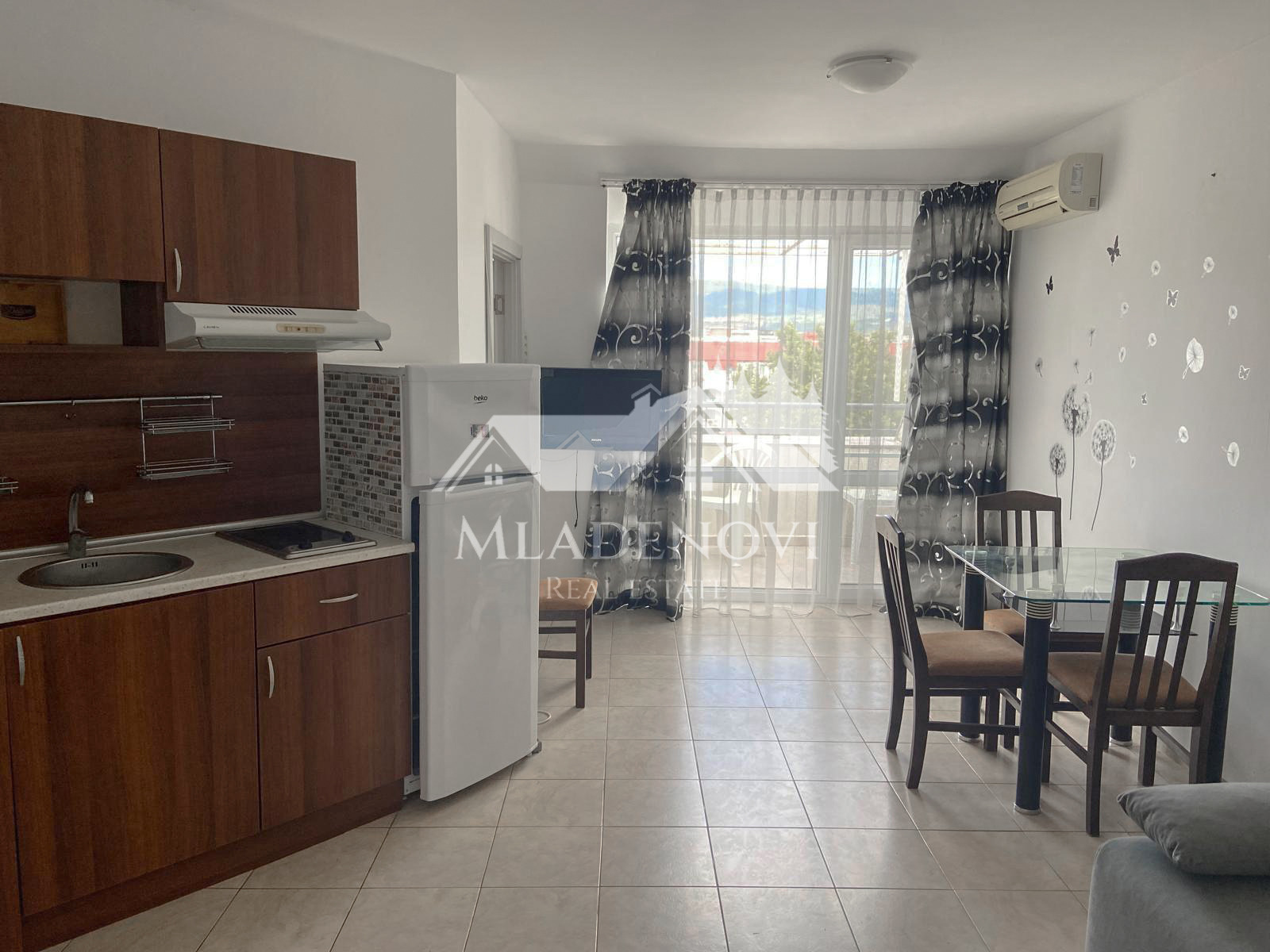 Имаме удоволствието да Ви предложим за продажба обзаведен двустаен апартамент, в комлекс от затворен тип в к.к.'Слънчев Бряг'. Жилището се намира на близо до ресторант 'Джани' и х-л Кубан, но в същото време, на тихо и спокойно място, с лесен достъп до плажа. За своите гостите и собственици предлага редица удобства като; басейн, детска площадка, ресторант, рецепция, видеонаблюдение и паркинг. Комплексът е целогодишен. Самостоятелни партиди за ток и вода. Таксата подрдръжка е 12.00 Евро на кв.м. с ДДС годишно. Апартаментът се състои от всекидневна със светъл кухненски кът, тераса, самостоятелна малка спалня и баня с тоалетна. Жилището е напълно обзаведено и оборудвано, в чудесно общо състояние. Изключително светло и слънчево. Подходящо за целогодишно ползване.
