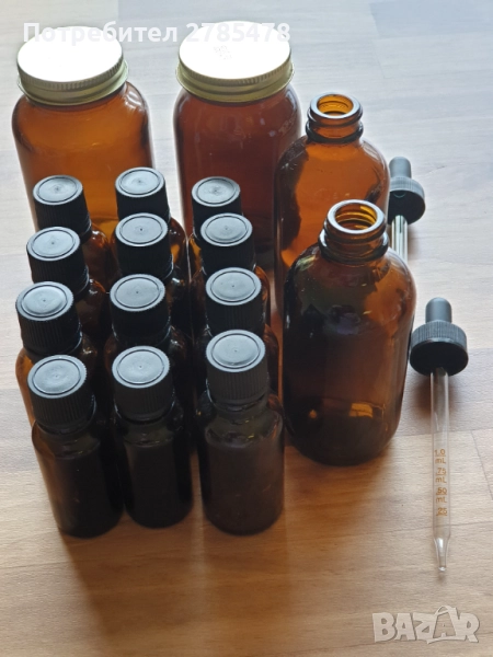 Тъмни стъклени бутилки за продажба. Използвани, но в добро състояние. Подходящи за съхранение на различни течности или за декоративни цели. Шишетата са с различни размери и форми, което ги прави подходящи за различни нужди. Двете големи са 200мл. Шишетата с капкомера са 2бр. по 115мл.. 10бр. по 30мл. и 2бр. по 20мл. Използвани са веднъж. Цената е за всички -24лв. София