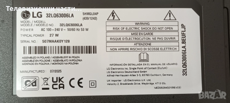 LG 32LQ63006LA със счупен екран HC320DUN-ABXL1-A1BX HV320FHB-N02/EAX69091402(1.0)/EAX69822904(1.1)