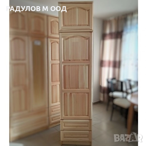 Гардеробът тип колона е изработен от висококачествена масивна чамова дървесина. Разполага с 1 врати - отделение с лост за закачалки, 2 чекмеджета и надстройка.