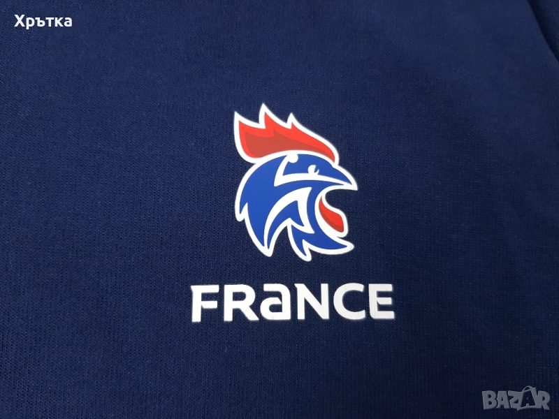 Емблема на националния отбор на Франция + Adidas лого отпред – термопечат, устойчив на пране.