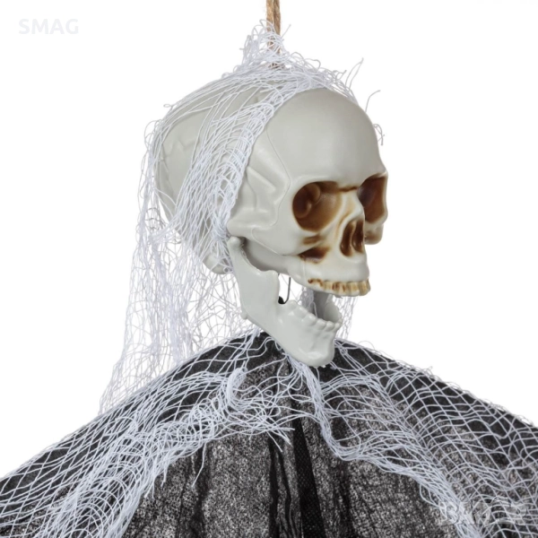 Създайте страховита Halloween / Хелоуин атмосфера с този висящ декоративен скелет! Изработен от пластмаса с черен плат и марли, той добавя драматичен и зловещ акцент към вашата декорация. Перфектен за дома, градината или парти пространство, този скелет прави Halloween / Хелоуин украсата още по-реалистична и впечатляваща.