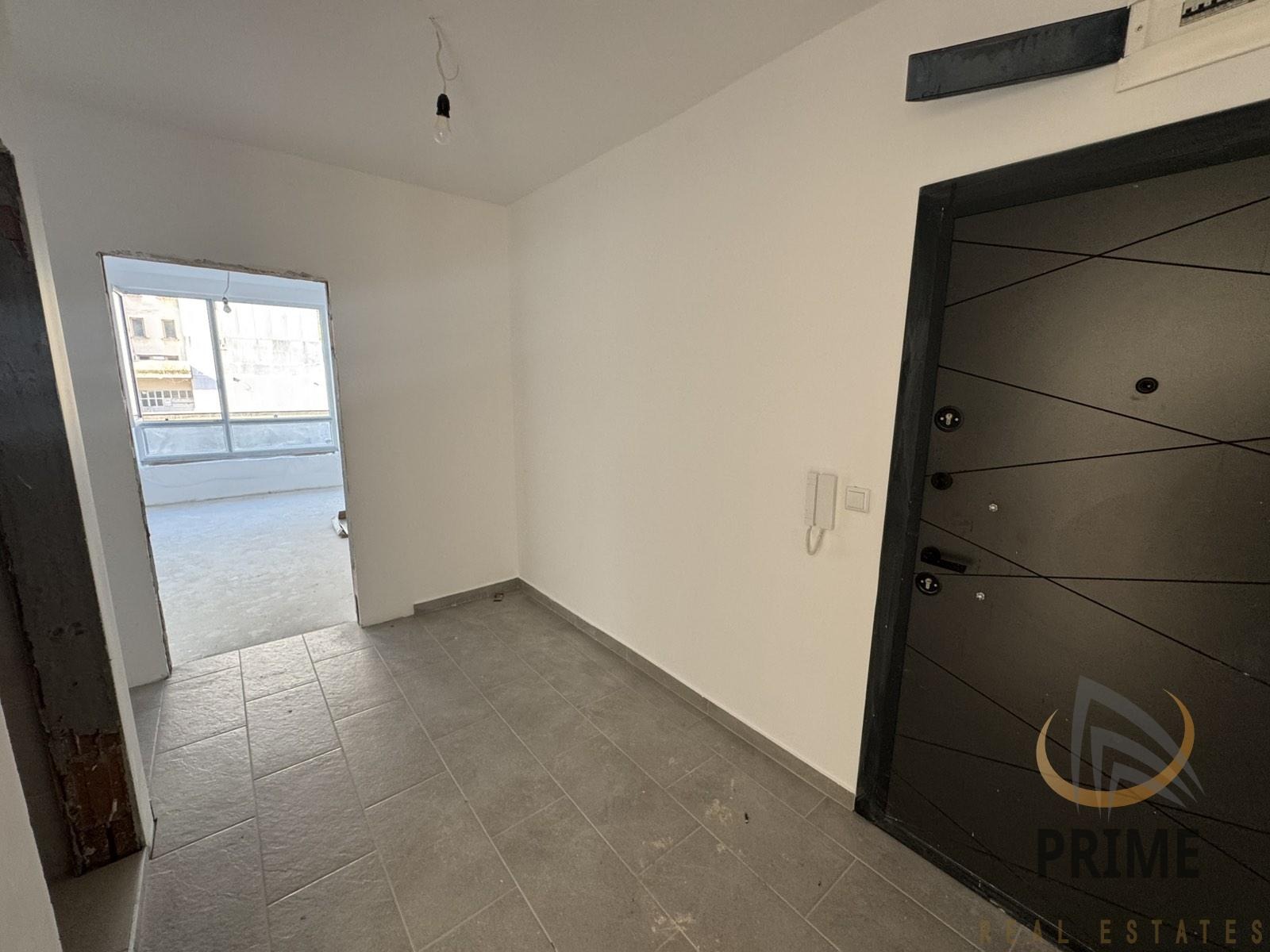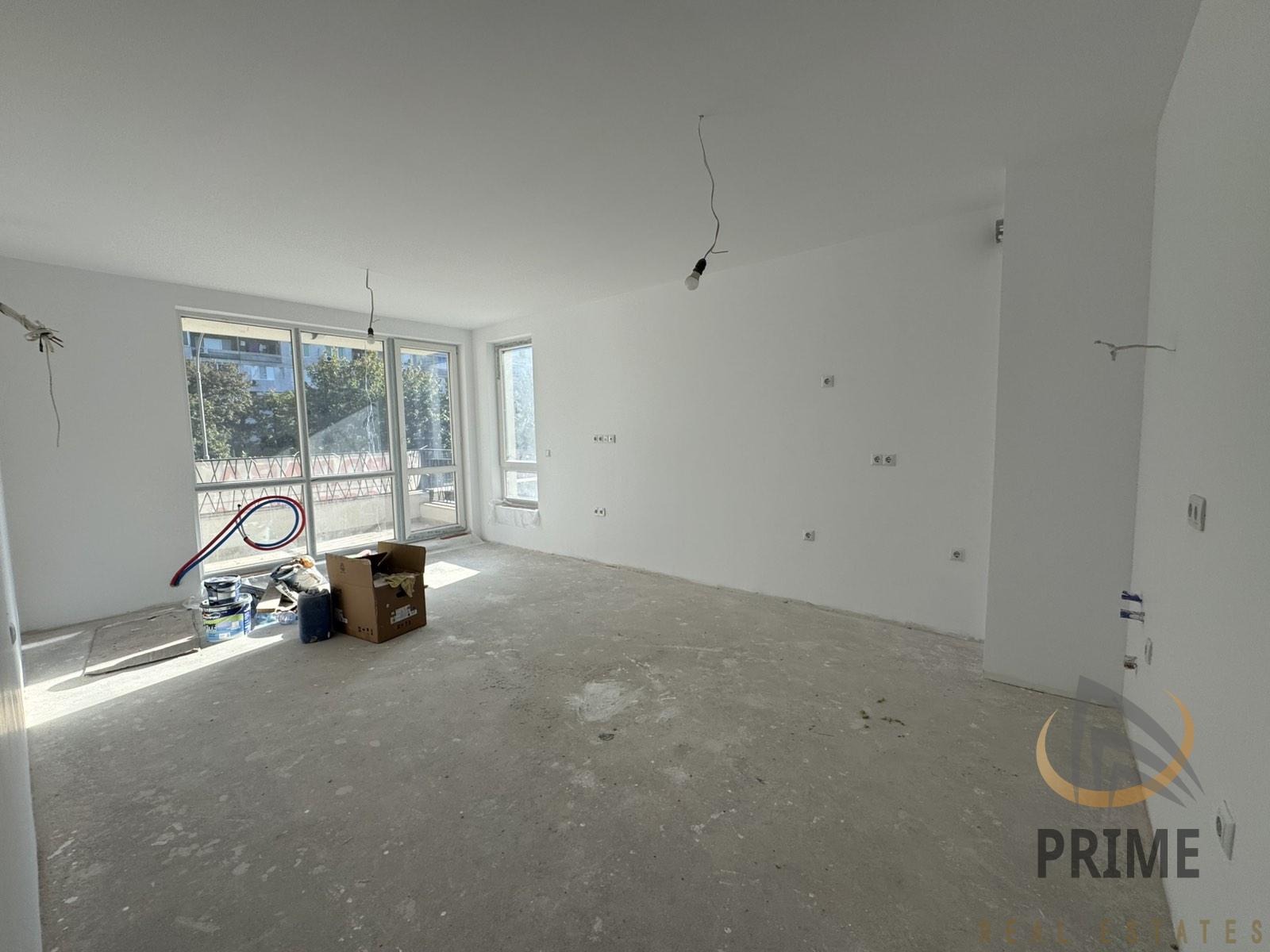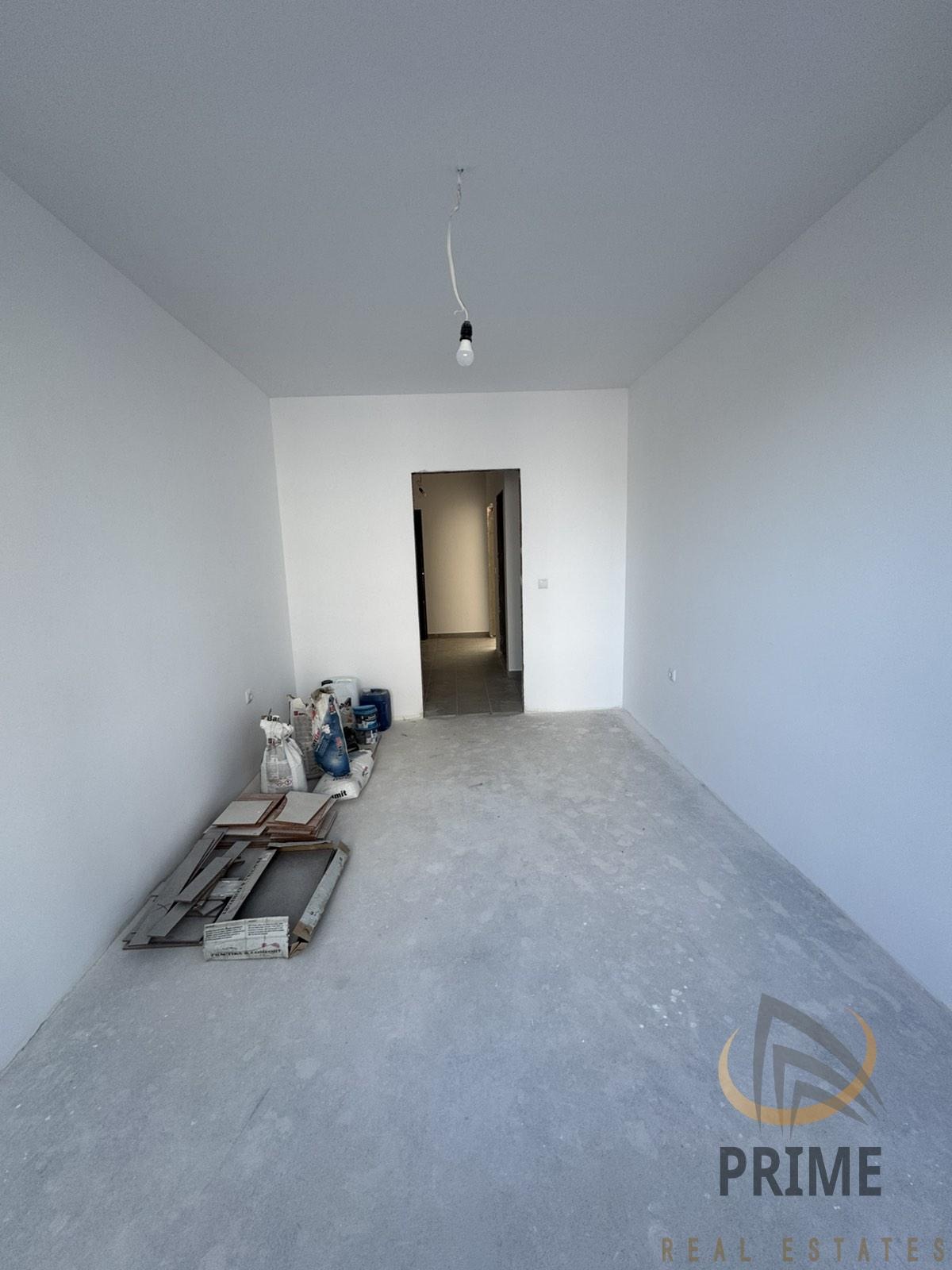 Апартамента се състои от просторен коридор с поставен гранитогрес, хол с трапезария и кухненски бокс, две спални, просторна баня с тоалетна с поставен фаянс, теракот и частична санитария и две тераси. Стените са на латекс.
