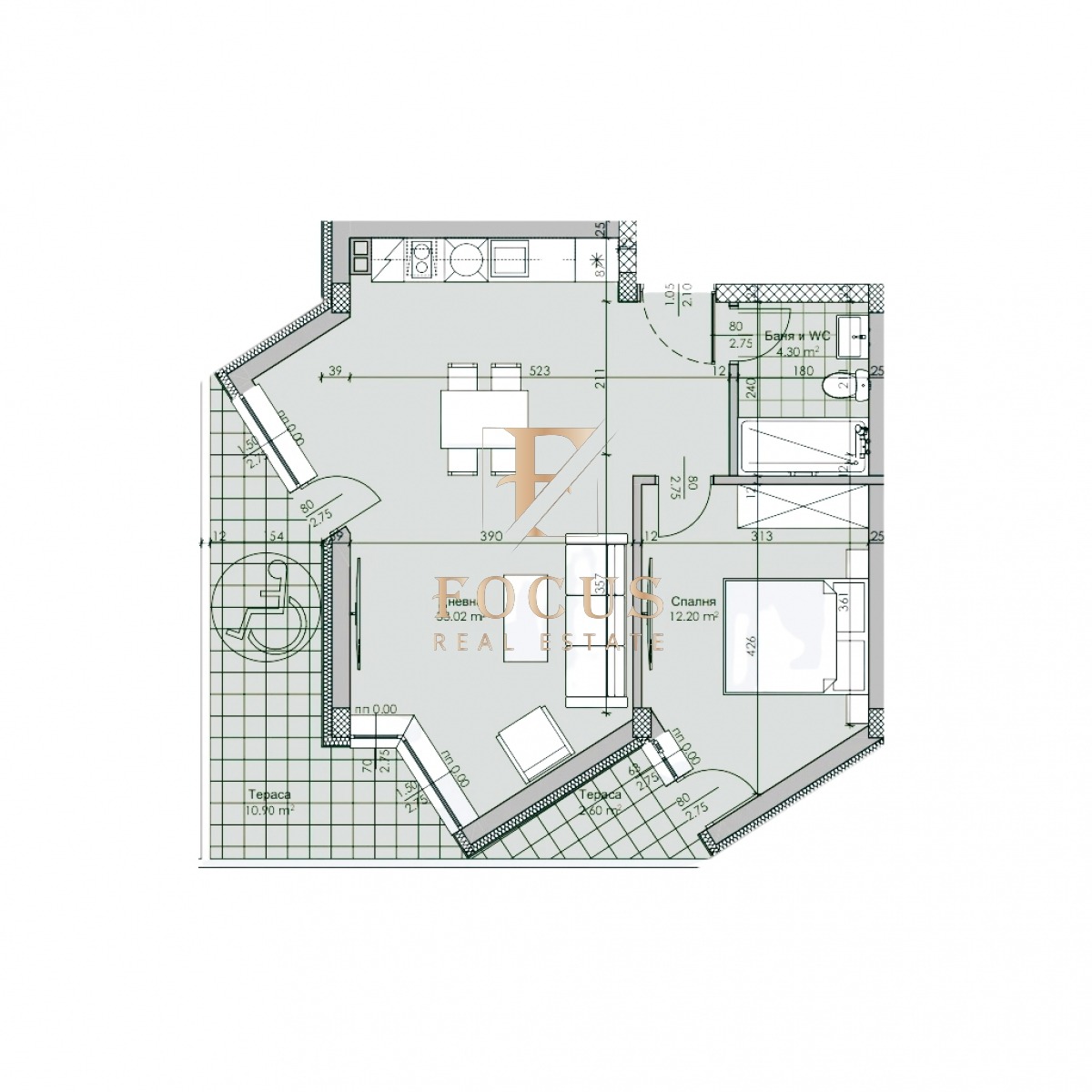 Разпределение: антре, дневна с кухненски бокс, спалня, баня с тоалетна и две тераси.