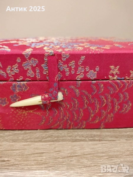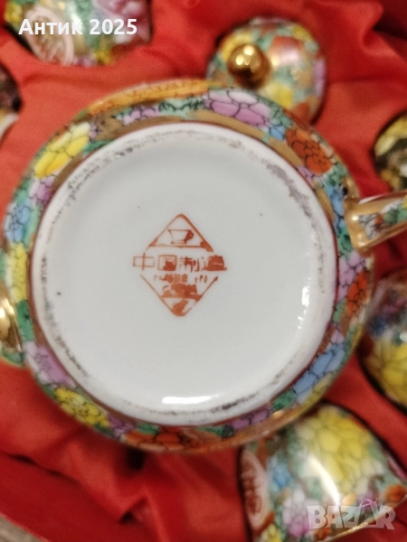 Подаръчен порцеланов комплект Made in China, в традиционен китайски стил „Famille Rose“ (цветен орнамент с позлата). Комплектът е напълно нов, не е използван, но е от по-старо производство (около 1960–1990 г.). Изработен от фин порцелан с ярка ръчна декорация в класически китайски стил. Комплектът съдържа: чайник / кана за саке; 6 малки чашки; декоративна чиния; оригинална подаръчна кутия с червен копринен вътрешен слой. 📍 Състояние: ново, без пукнатини и отчупвания 🏷️ Маркировка: 中国制造 / Made in China (експортен знак) 📦 Произход: Китай, край на XX век 💬 Подходящ за колекционери, любители на източната култура или като оригинален подарък.
