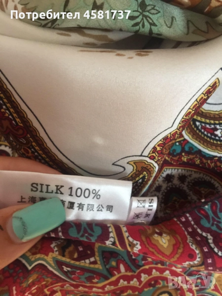 . Наситени цветове, тежко падаща, лъскава коприна, гладка материя, която е истинско удоволствие за кожата. Шалът е голям, което позволява много комбинации за връзване.