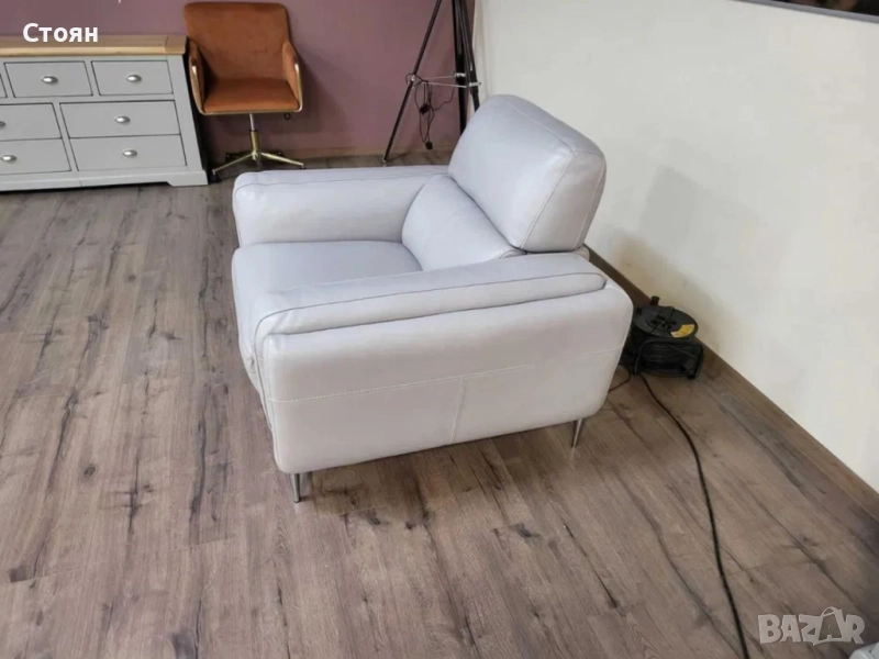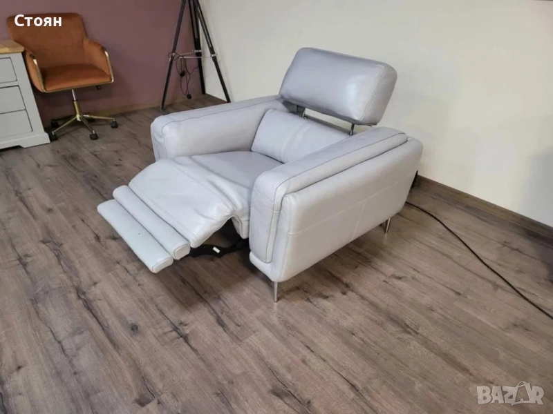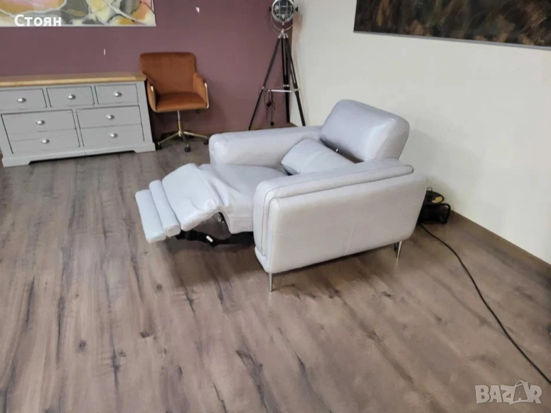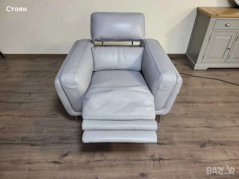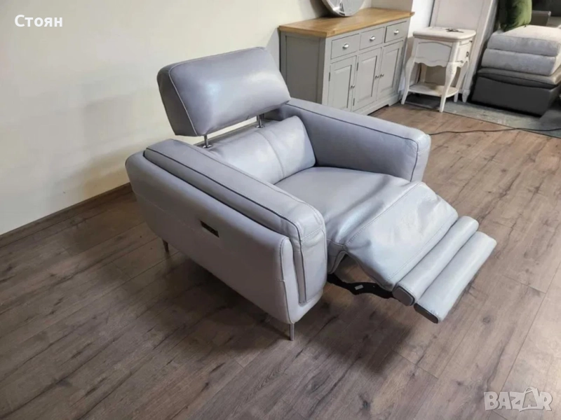 Сив кожен фотьойл с електрически релаксиращ механизъм за краката и облегалката.