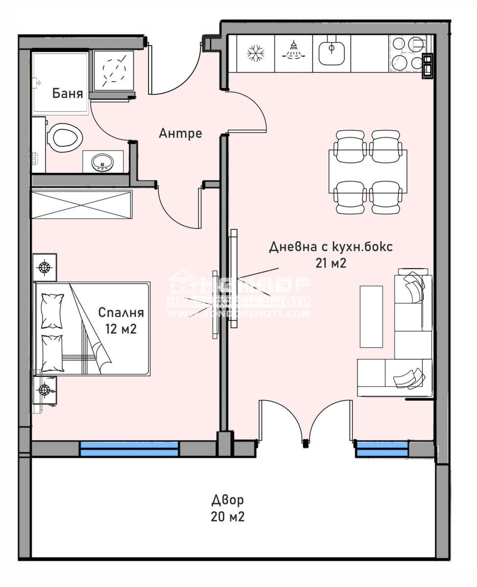Апартаментът който Ви представяме е със следното разпределение: светла дневна с трапезария и кухненски бокс, спалня, Баня с тоалетна, входно антре и собствен ОЗЕЛЕНЕН ДВОР ОТ 20 кв.м.