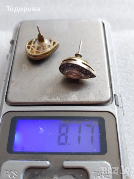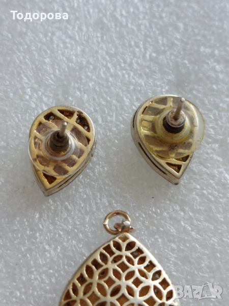 За продажба комплект медальон с обеци,може да се закупят и поотделно.Материал сребро и злато поставени огромни стари диамантени люспи.