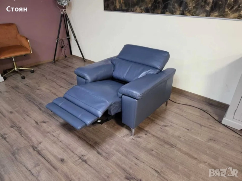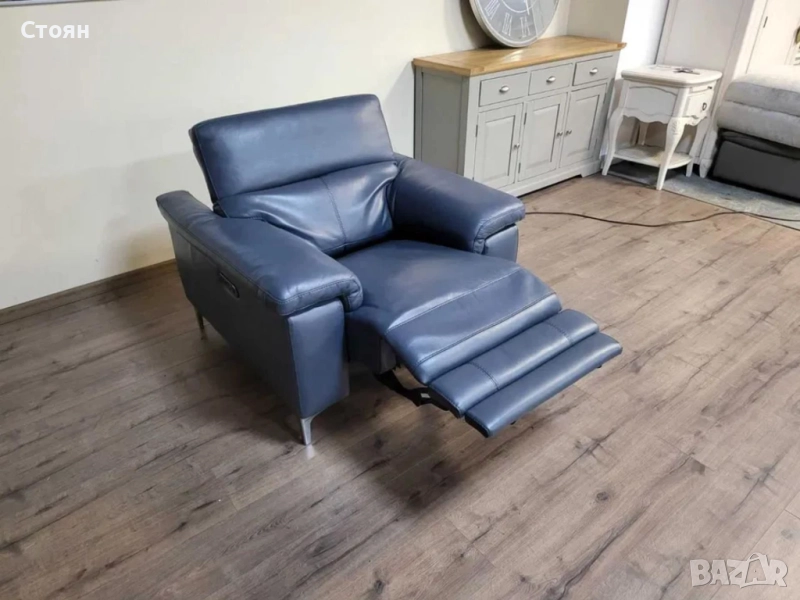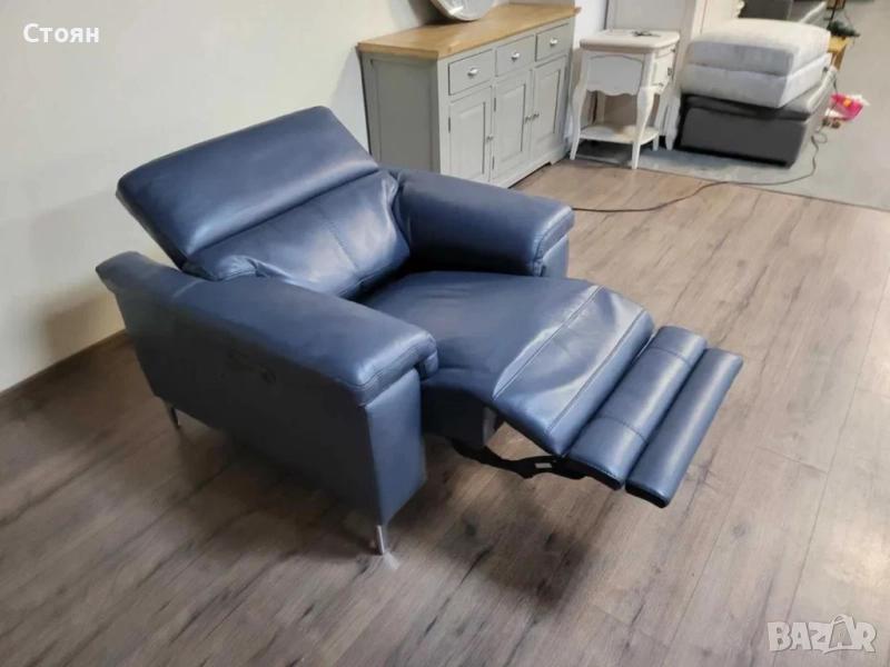 Син кожен фотьойл с електрически релаксиращ механизъм за краката и облегалката.