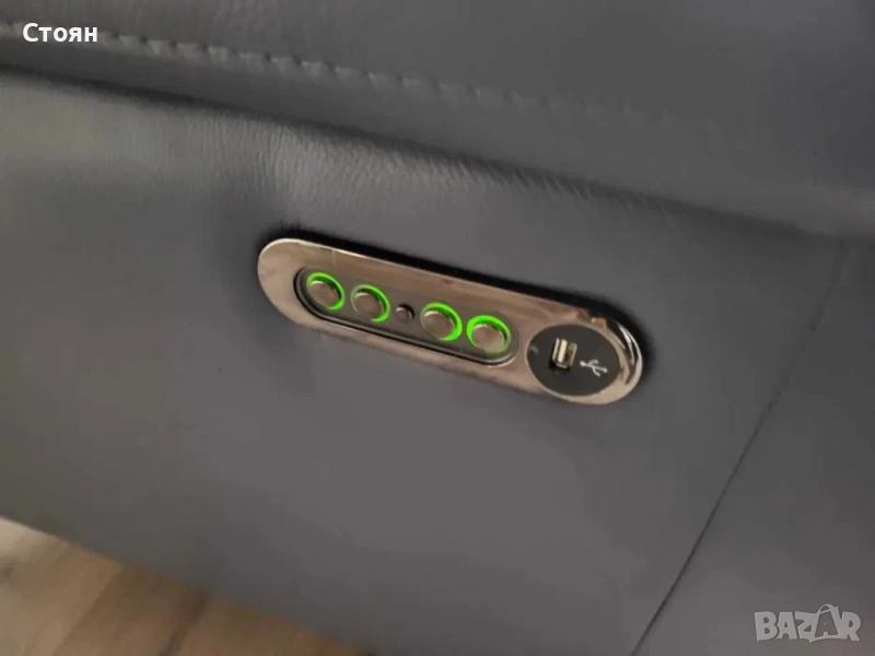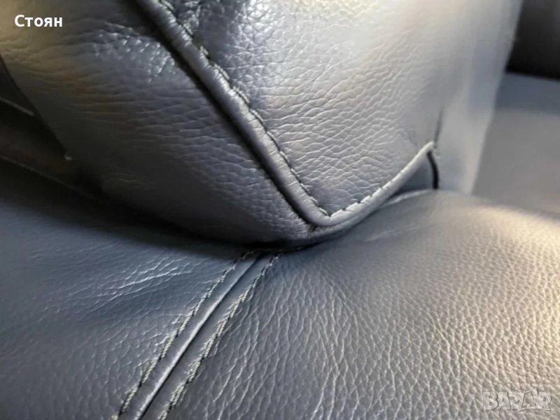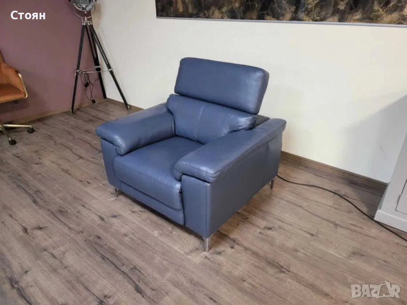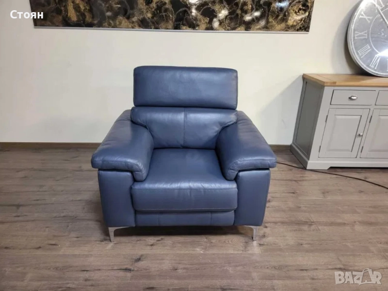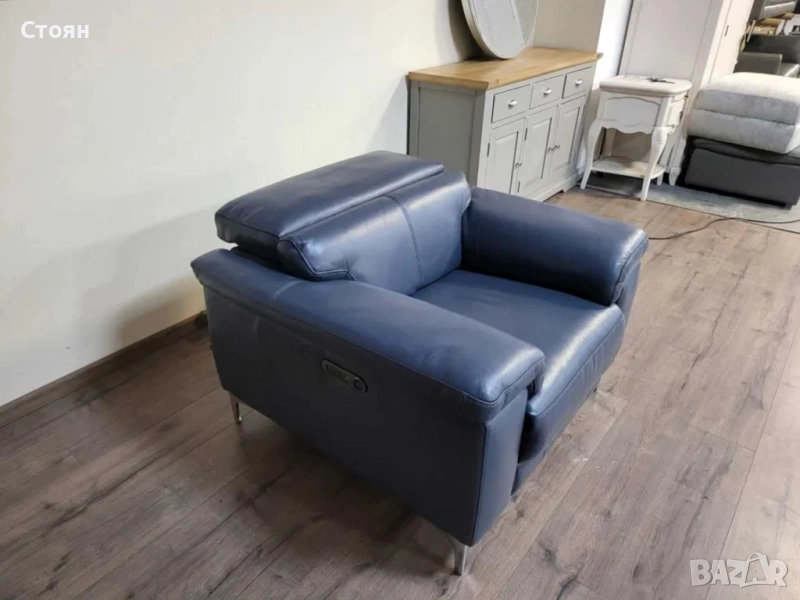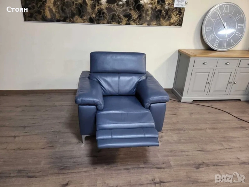 Син кожен фотьойл с електрически релаксиращ механизъм