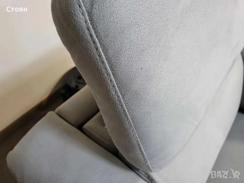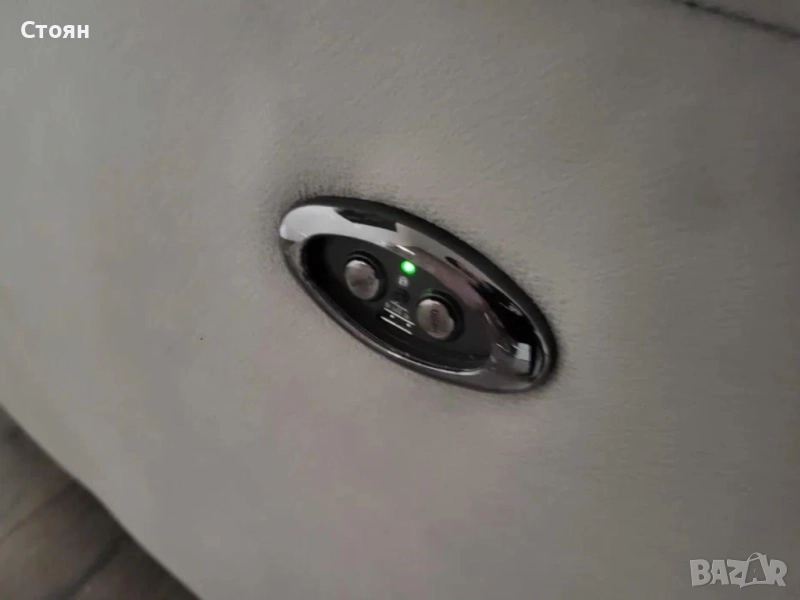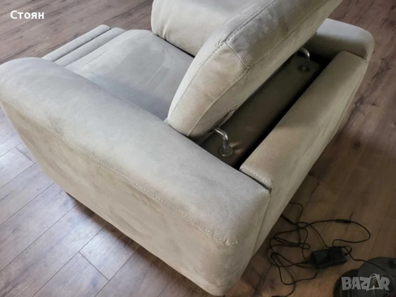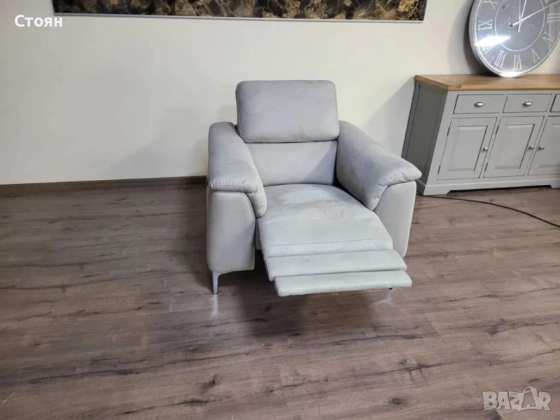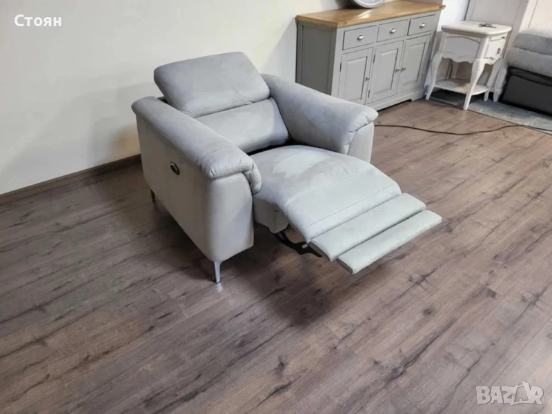 Светло сив фотьойл от плат с електрически релаксиращ механизъм за краката и подвижна облегалка.