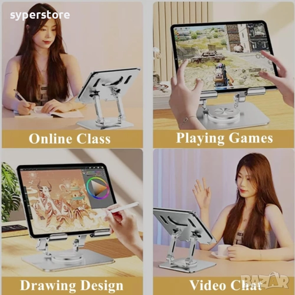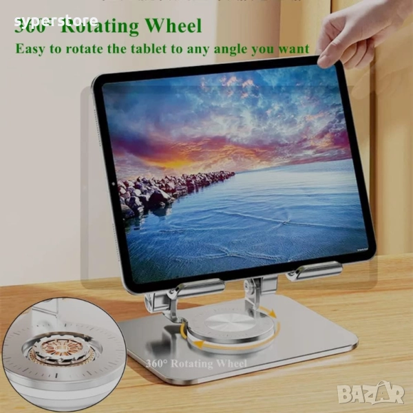 Стилна стойка за таблет за Бюро Маса.Сгъваема стойка за таблет, с подложка против хлъзгане, с завъртане на 360 гр. и регулиране наклона на таблета.