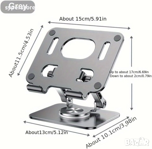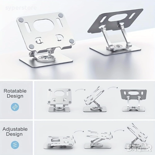 Универсална стойка за таблет, подходяща за всички видове таблети и таблет pc, с омекотени зони на захват, предпазващи устройството ви. Сгъваема преносима стойка за таблет, с регулируема посоката по хоризонтал на 360 гр., регулиране вертикалния наклон на 90гр, и дизайн против хлъзгане, гумирани подложки против преплъзване.