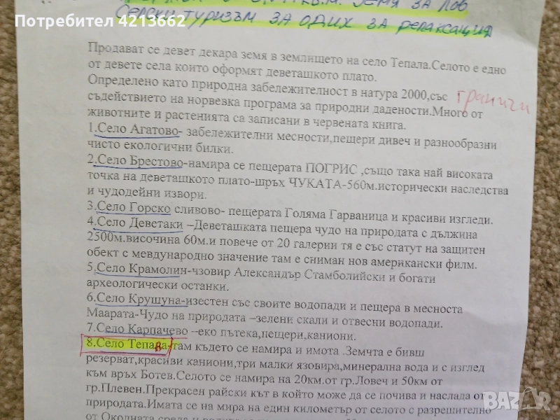 уникално място надморска височина 500 м на 50 км от Плевен с Тепава намира се близо до деветашкота пещера наоколо каньони пещери язовир река Осъм дъбова гора дивеч бившо лесничейство определено от юнеско за природна забележителност гъби трюфели могили ,вижда се връх Ботев население 40 човека детсвена природа чист въздух минерална вода , земята е на 1,5 км от центъра на селото ,натура 2000 със разрешение за 100 кв м дървена вила и 1000 кв м селскостопански сгради райско място за ценители на спокойствие чист въздух и красота и спокойствие така известното ДЕВЕТАШКО ПЛАТО ЦЕНА ПРМОЦИЯ