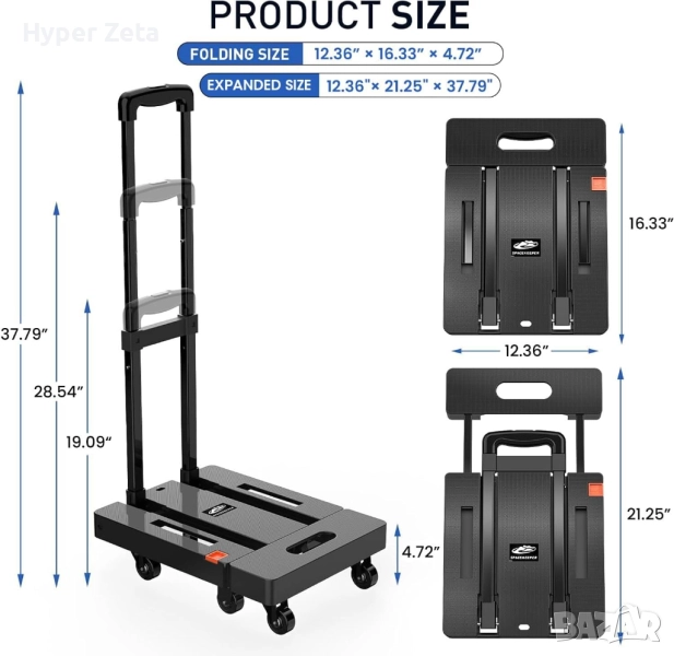 6 колела с двойни лагери, регулируема дръжка в три положения, разширяема платформа за по-големи товари.