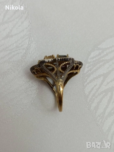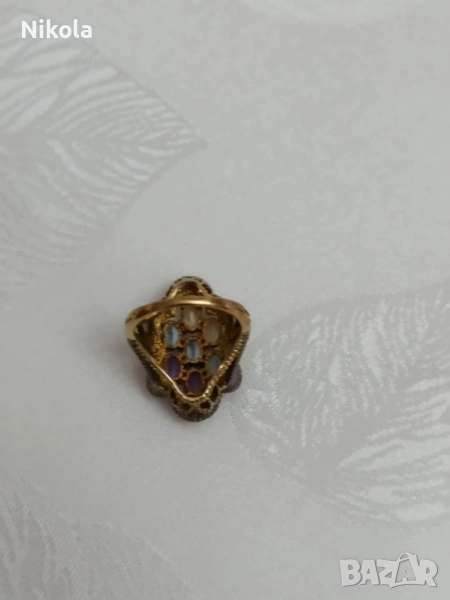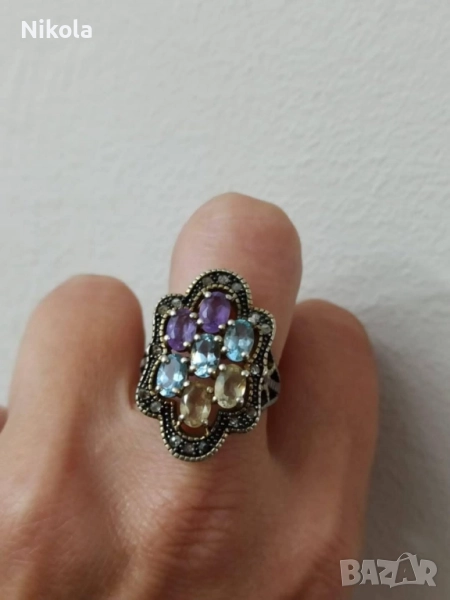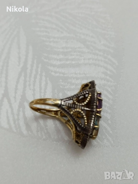 Антикварен дамски златен пръстен със сребро - диамантчета, цитрин, аквамарин, аметист-9карта. → Обява 52011520