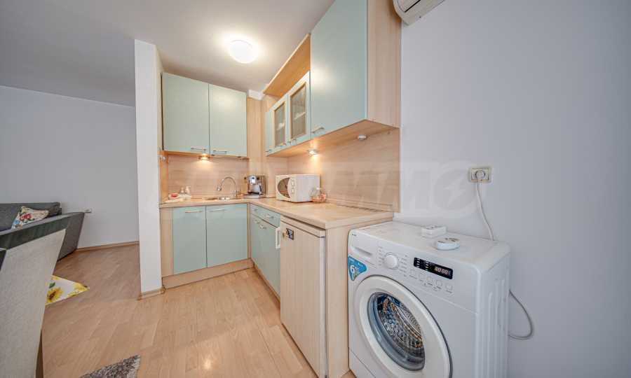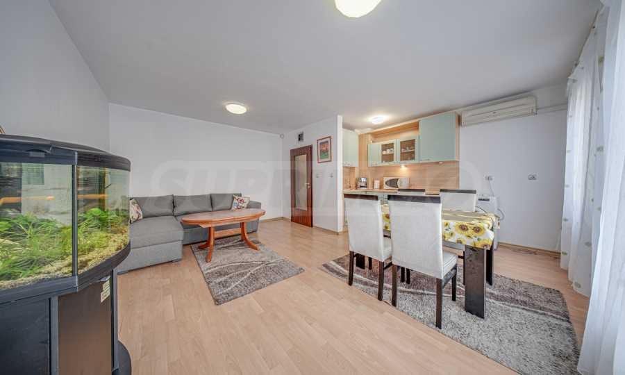 Просторна и светла всекидневна с разтегателен диван, кухненски бокс и трапезария;
