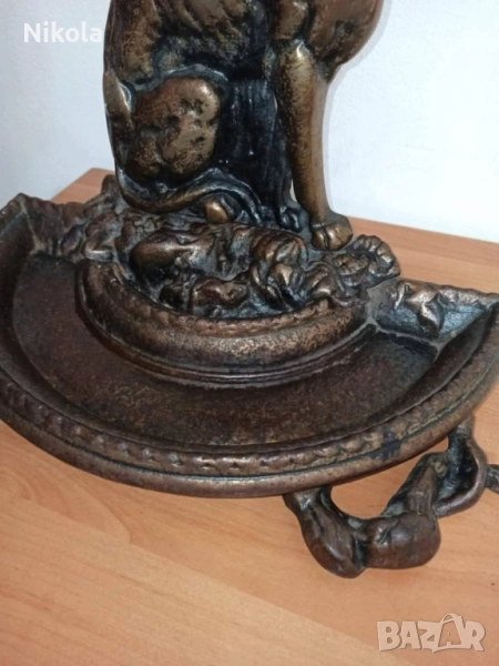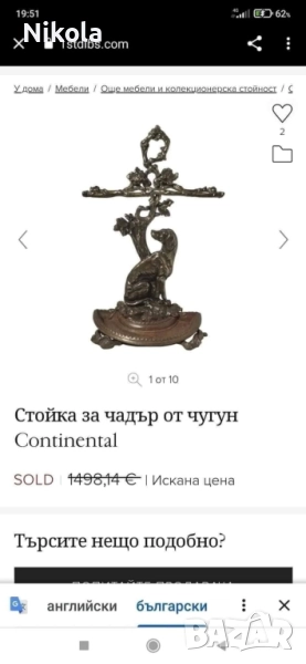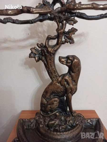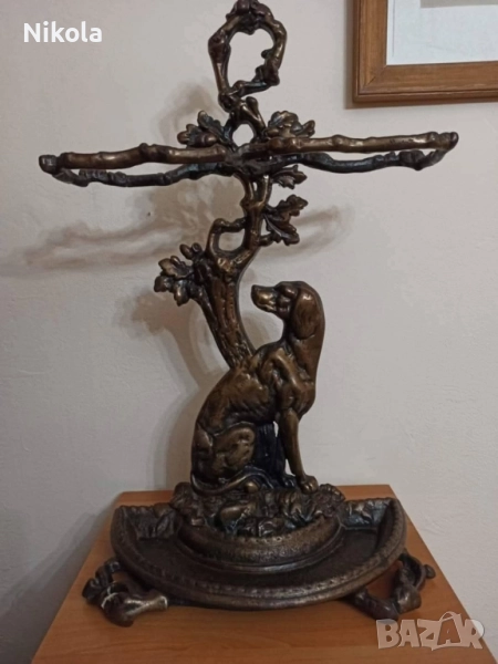 Викторианска чугунена стойка за чадъри с патинирано бронзово покритие, под формата на хрътка с отделяща се полукръгла тава за отцеждане. Период 1920-1929.Адски масивна с размери 70 /45 см добавена е снимка на реалната и цена която е 1500 долара на която е продадена в международен сайт същата като тази. Цена 1200 лв