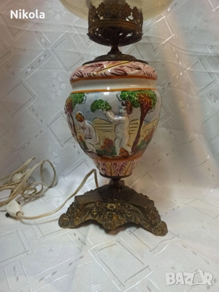 Антикварна висока настолна лампа Capodimonte -бронзова основа с орнаменти над нея порцелан с релефни образи- ръчно рисуван порцелан,осветителното тяло е олекотено стъкло с красиви елементи .Лампата е 56 см висока и е ,действаща .Донесена е от Италия .