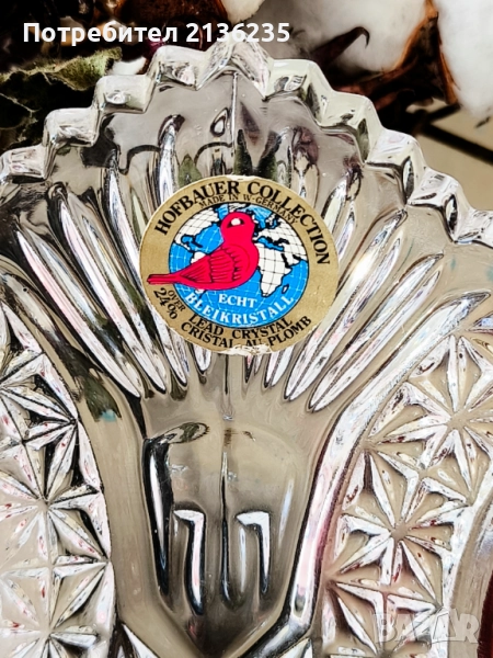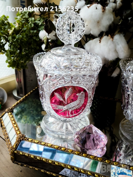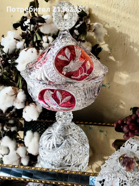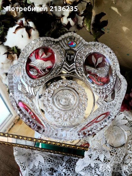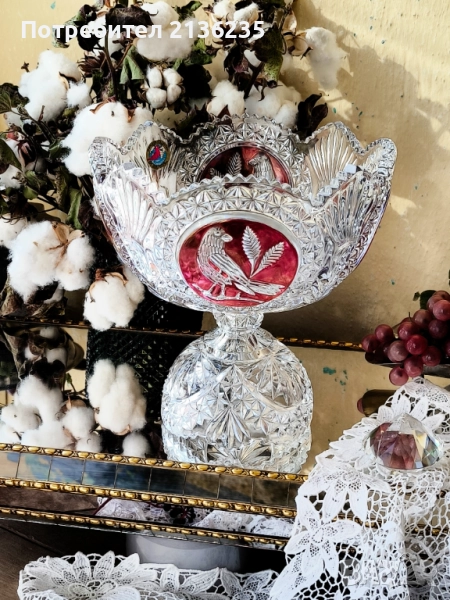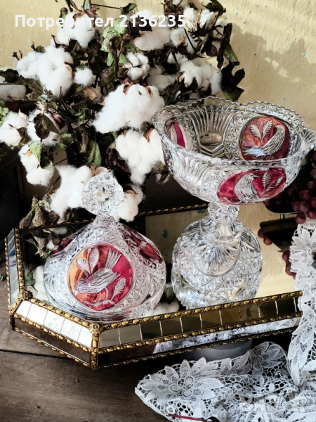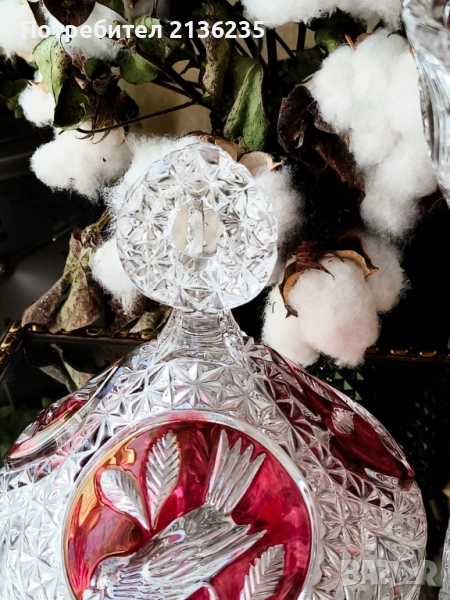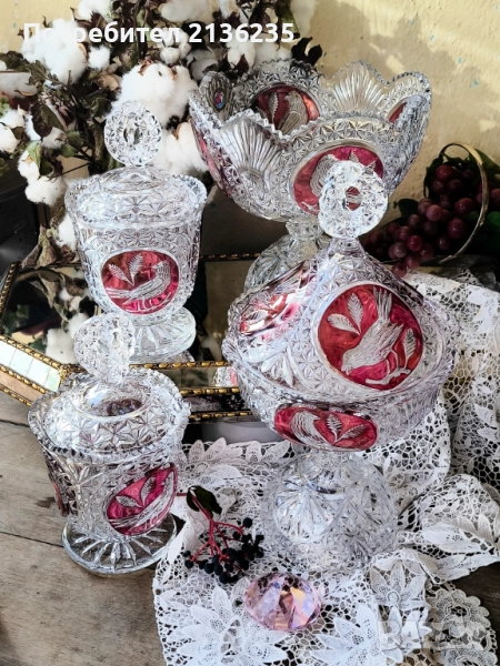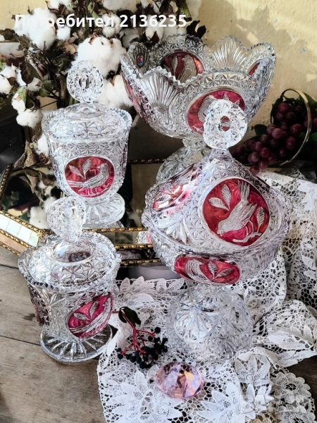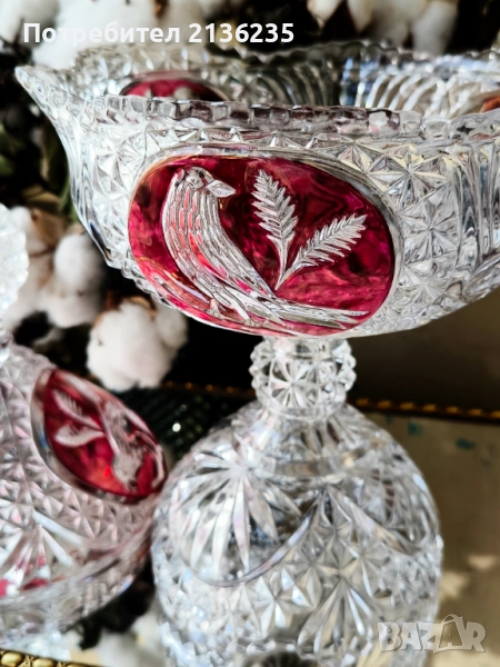 Кристален комплект от серия Byrdes на Hofbauer Collection, произведен в Западна Германия. Изработен от тежък оловен кристал с рубинено червено покритие (overlay) и ръчно гравиран релефен декор с птици. Отличава се с характерната дълбока шлифовка и висококачествена изработка, типична за марката.