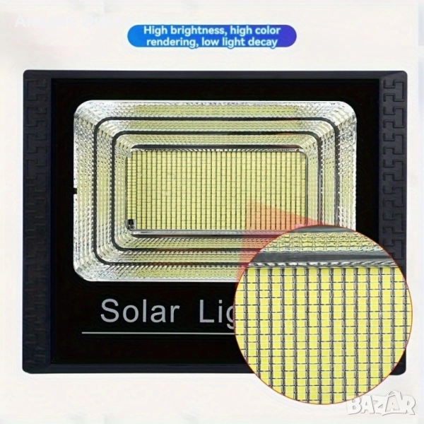 Контролен метод: Дистанционно; Специални функции: Водоустойчив; Тип приспособление: Разглобяем; Форма на осветителното тяло: Прожектор; Форма: Правоъгълна; Материал на абажура: Стъкло; Тип монтаж: Полувграден монтаж; Включени компоненти: Множество компоненти; Материал: Метал; Захранване: Слънчево зареждане; Включено дистанционно управление: Да; Включени батерии за дистанционно управление: Да; Свойства на батерията: Слънчева батерия; Мощност на лампата: 300W; Материал: ABS+PV модул; Слънчев панел: 35W Моно; Размер на продукта: 530*250 мм.; Светлинен поток: 4500LM NW/GM; Батерия: Литиева; Капацитет на батерията: 20 000 mAh; Ъгъл на лъча: 120; Температурен диапазон: -20 +65; Тегло: 2,5 кг.; Защитен клас: IP 66; Тип светлина: Студена; Предназначение: За дом, градина, тераса; Тип монтиране: Окачване, самостоящ, чрез фиксиране. Варианти: 1-200W - цена 55 лв. 2. - 300W - цена 92 лв. 3. - 400W - цена 99 лв. 4. - 500W - цена 113 лв. 5. - 600W -цена 120 лв