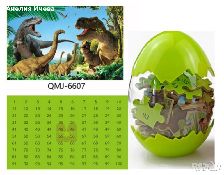 Пъзел с динозаври – 100 части / Цели 100 части; Реалистична картина; Страхотно изобразени графики; Висококачествен дизайн; Наситени цветове; Удобен съд за съхранение; Номерация от 1 до 100 на задната част на частите;