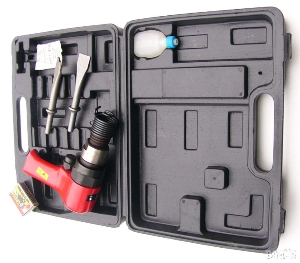 • АРТИКУЛ: Професионален Профилен КУФАР за Комплект Пневматичен Инструмент Къртач с Държачи и Принадлежности Аксесоари Секачи Длета Чукове Пробои и др.; (Pistol Grip Air HAMMER Kit Blow Molded Tool Case);