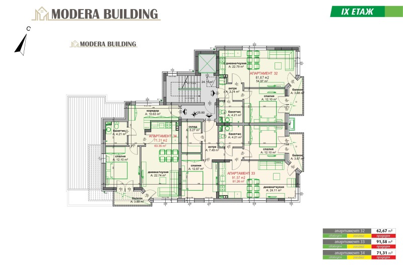 Сградата се намира на ъгъла до терминал ЮГ с изложение ИЗТОК - ЮГ, с иновативна архитектура, висок клас на изпълнение, целящ дългосрочна и безпроблемна експлоатация на всеки имот с ниски енергийни разходи. Едно от предимствата с които се гордеем е топло и шумоизолацията която правим в нашите сгради, а имено топлоизолация по тавани и под на всеки апартамент, както и топло и шумоизолация межди всеки апартамент. Сградата се състои от партерен етаж и девет жилищни етажа с по четири апартамента на етаж, два двустайни и два тристайни. За повече информация и налични свободни имоти, можете да разгледате сайта https://moderabuilding.com