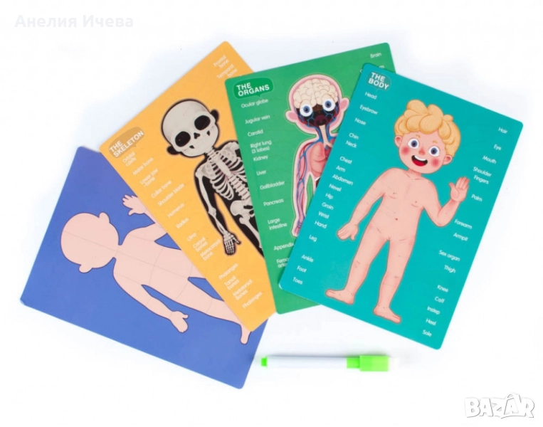 Тип продукт: Образователни игри ; Всяко дете е любопитно – интересува се от какво е направен света, как работят нещата, а едни от най-често задаваните въпроси са за човешкото тяло – от какво се състои, кое къде се намира, какво представляват сърцето, мозъкът и т.н. Този чудесен комплект е идеалният начин вашето мъниче да се запознае по достъпен и забавен начин с основите на човешката анатомия. Върху магнитната дъска детето само сглобява пъзел с тяло на момченце, тяло на момиченце, човешкия скелет, модел на основните органи или каквото избере от шестте различни карти с нарисувани различни анатомични системи, а когато е готово, дъската лесно може да се закачи на стената! Подходящо за деца над 3 години