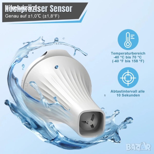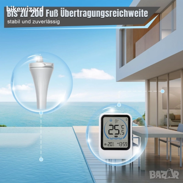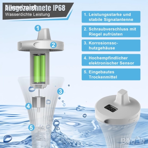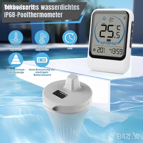 Термометър за басейн с плаващ дизайн и многофункционален LCD дисплей - IP68 водоустойчив, безжичен термометър за басейн, обхват на приемане на сигнала 60 метра (батерии не са включени в комплекта)