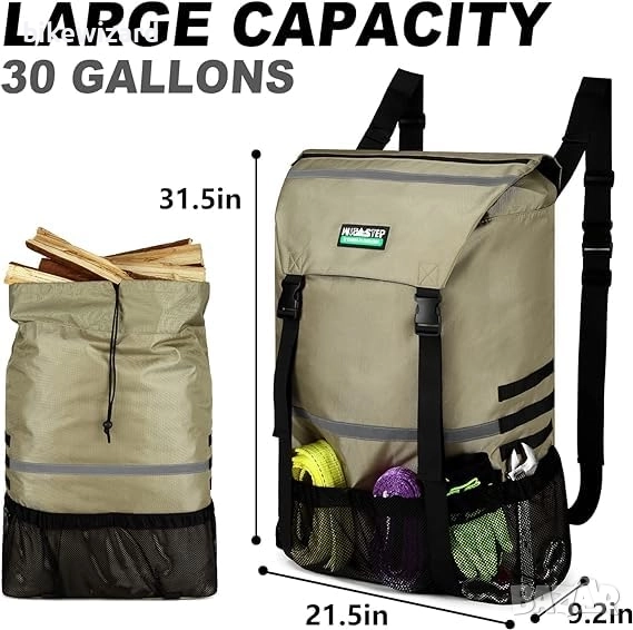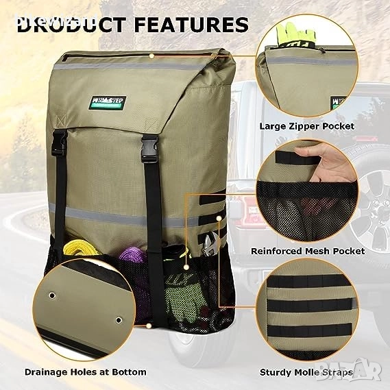 офроуд превозни средства с резервни гуми. Тази торба за боклук за резервна гума е идеалното решение за всеки авантюрист, който иска да поддържа превозното си средство чисто и организирано, докато е на път. ИЗКЛЮЧИТЕЛНО ГОЛЯМ КАПАЦИТЕТ -- С размери 31,5 x 21,5 x 9,2 инча, нашата офроуд торба за боклук има невероятен капацитет до 30 галона, осигурявайки достатъчно място за всички ваши нужди за изхвърляне на отпадъци. Чантата разполага с горен джоб с цип за съхранение на мръсни дрехи или обувки. Четири външни мрежести джоба и тактически каишки MOLLE за съхранение на инструменти за къмпинг, спасително оборудване и други. ЗДРАВ МАТЕРИАЛ -- Изработена от подсилен плат 1680 Denier с водоустойчиво вътрешно покритие, тази чанта за съхранение на резервна гума е създадена да издържи дори на най-суровите метеорологични условия. Презрамките и зоната на катарамата на торбата за боклук са двойно зашити, за да се осигури максимална издръжливост и дълготрайност. УДОБЕН ЗА ПОТРЕБИТЕЛЯ ДИЗАЙН -- Торбата за боклук за резервна гума е с удобен за потребителя дизайн, който включва 2 найлонови капака за дълготрайна употреба и допълнителна защита, светлоотразителни ленти за допълнителна видимост и безопасност и два дренажни отвора в долната част, за да се гарантира, че торбата ще остане суха и без мирис. ЛЕСЕН МОНТАЖ -- Торбата за боклук за резервна гума WITSTEP е проектирана с мисъл за лесна употреба. Тя е оборудвана с висококачествени X-образни ремъци и здрави катарами, които правят монтажа лесен, като гарантират, че торбата ще остане здраво закрепена към резервната гума, дори по време на неравномерно каране.