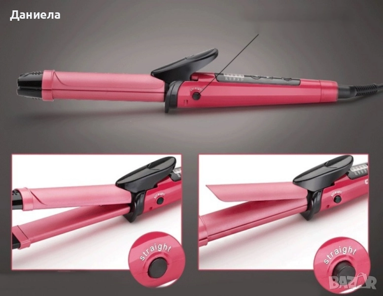 Може да прави малки и големи къдрици; Функция Еasy lock – Да; Калъф – Не; Цвят – Розов; Плочата е направена от нано керамика; 35 см дължина; Диаметър на плочата 2,6 см; 5 нива на гореща температура (120-200 градуса C); Бутон ВКЛ / ИЗКЛ; Кабелът може да се върти до 360 градуса; Технология за защита на цвета на косата, перфектно защитава цвета на косата, дори когато често се изправя; Мощност 45 вата; 220-240v; 50 / 60Hz. Многофункционалната маша за коса е 1 инструмент с 2 функции. Nova 2 в 1 може да изправи вашата коса и едновременно с това да я накъдри на нежни и вълнообразни къдрици. Удобният инструмент е идеален за всяка дама. Изработен е от 100 % розова керамика. Оборудван е с цифров контрол на температурата с нива от 1 до 5 и 45 вата мощност. Кабелът е много удобен и може да се завърти на 360 градуса.