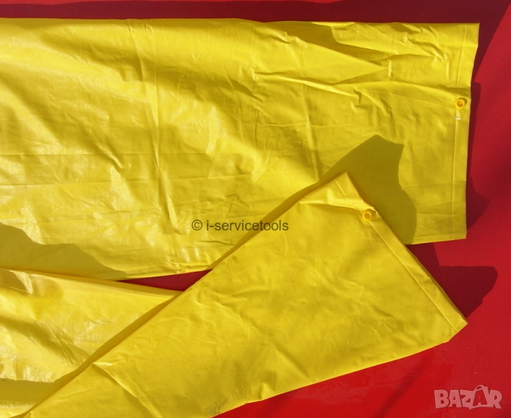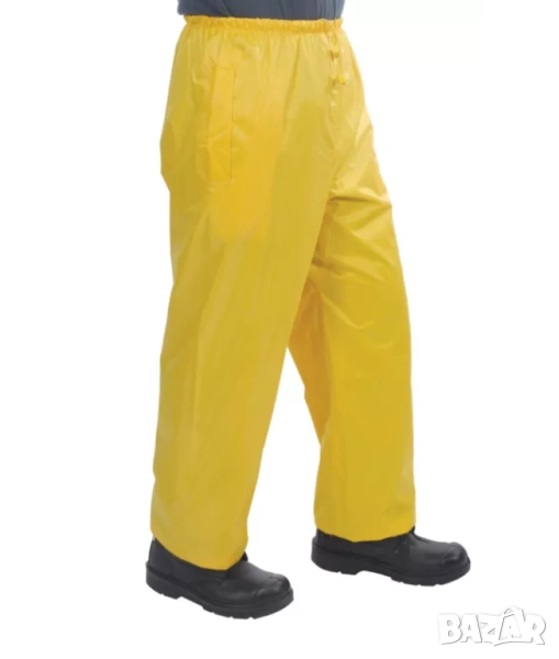Мъжки непромокаем водоустойчив водозащитен ветроустойчив ПАНТАЛОН-Дъждобран тип мушама за дъжд. Висококачествена изработка от непромокаема водоустойчива материя от усилен ПВХ с висока издръжливост. С ластична талия, топло лепени шевове, с копчета тик-так отпред и на подгъва на глезена за пристягане на крачолите. Леки - не запарват и осигурява ненадмината защита на краката с удобство при движение. Възможна комбинация непромокаем комплект водозащитен костюм с пелерина, пончо, анорак или яке с качулка и гумени ботуши. Практични, изключително удобни и функционални лични предпазни средства, гарантират комфорт при всякакви атмосферните условия и обща защита от дъжд, пръски агресивни течности и механични замърсявания, въздушни течения, както и изолация от студ. Подходящ за употреба за спорт, туризъм, катерачи алпинисти, къмпинг, лов и риболов, аварийна спасителна служба, на път в автомобила, при бране на гъби и горски плодове, ферма селско стопанство земеделие градинарство животновъдство скотовъдство, както и в строителство, автомивка, в месарски и колбасарски цех и др.специфични промишлени, механични и монтажни дейности.
