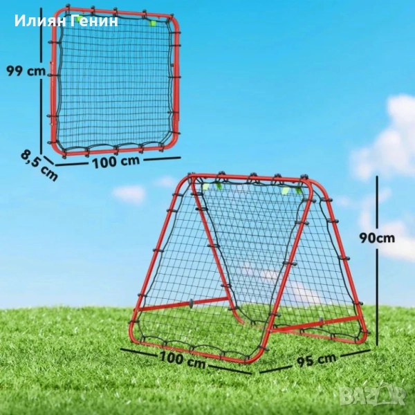 Спецификации на продукта за футболен отскок: 100Д x 68-95Ш x 90В см. Размери: 91Д x 91Ш см. Размери в сгънат вид: 100Д x 99Ш x 8,5В см. Необходим е лесен монтаж.
