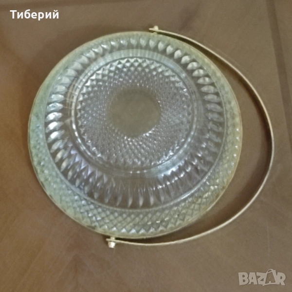 Винтидж кошница с дръжка от кристалин/пресовано стъкло/, Арт Деко от 30-те години на миналия век, без счупено или напукано, отлична за годините си. Размери , височина-6.5 см, диаметър-19.5 см. По Еконт с 10% отстъпка