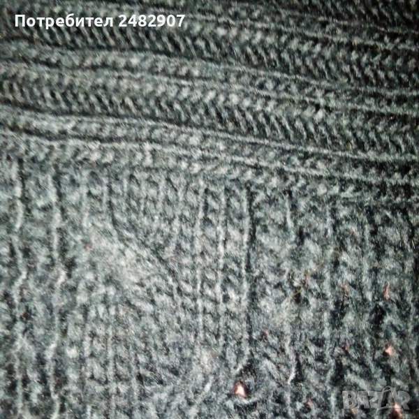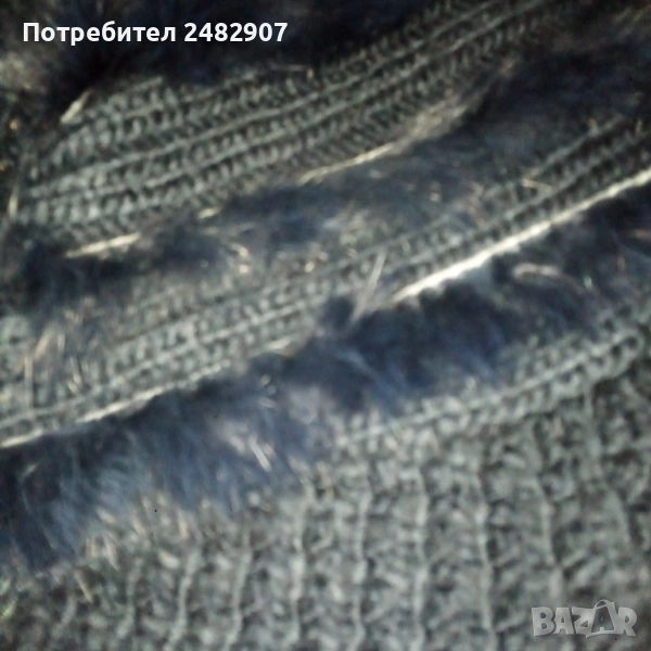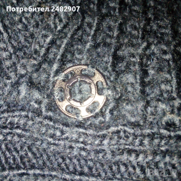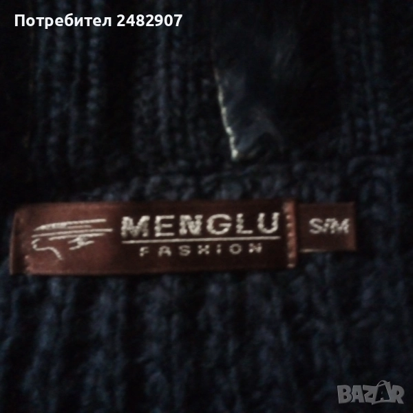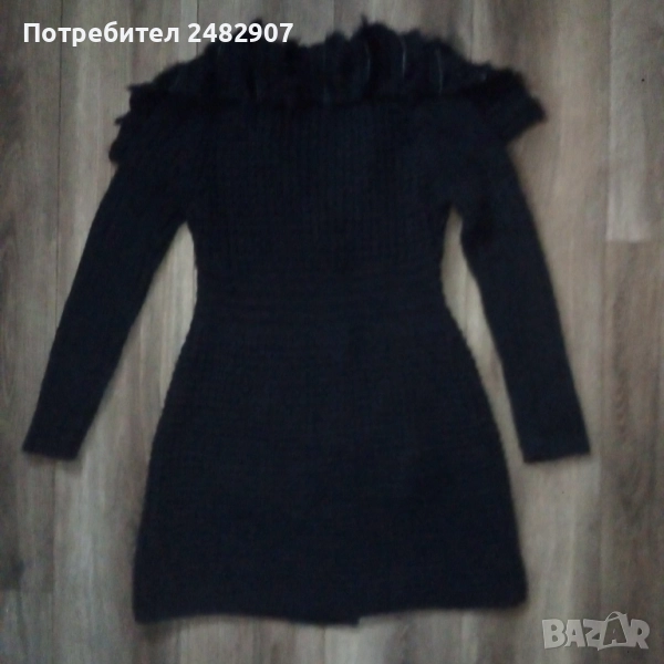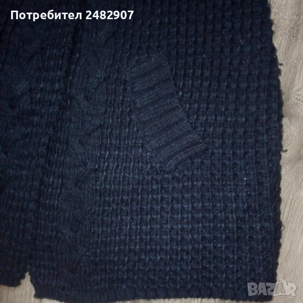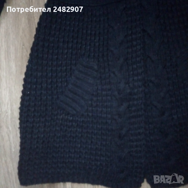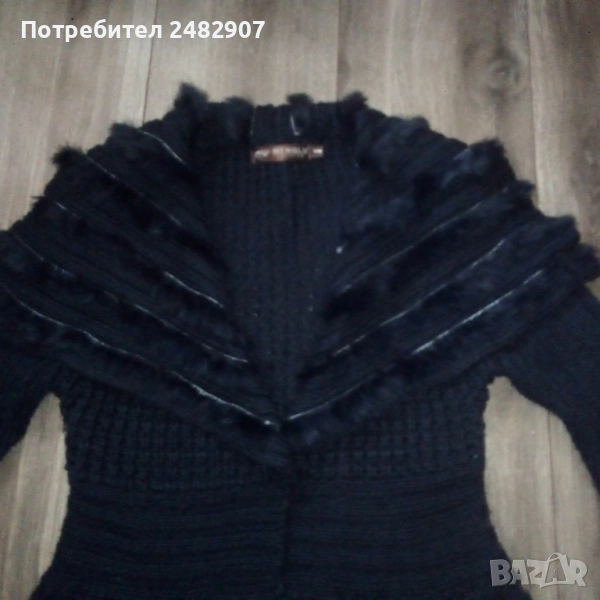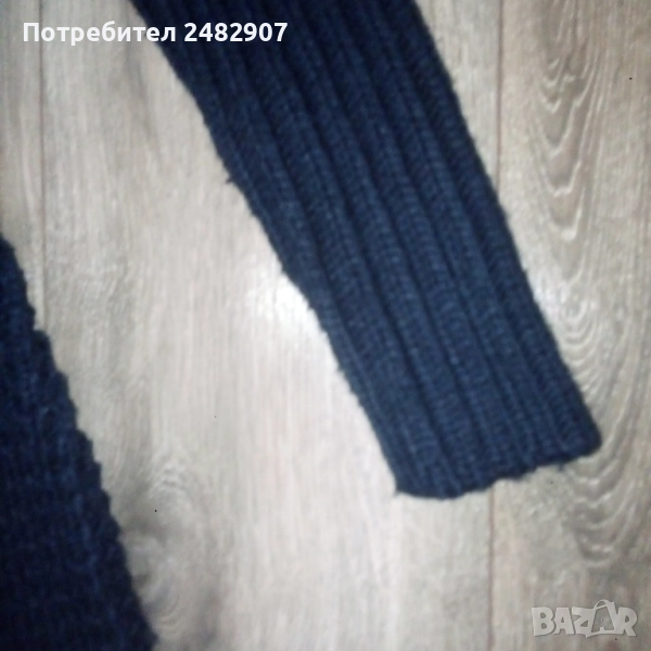 Машинно плетена ефектна дамска жилетка в мастилено син цвят, размер S/M. Съдържа 75 % акрил и 25 % вълна. Ширина в раменете - 35 см, ширина под мишниците - 42 см, ширина в талията - 36 см, ширина в долната част - 59 см, дължина от рамото до долу - 83 см, дължина на ръкава от рамото - 62 см, ширина на ръкава в долната част - 9 см. Много запазена, почти не е използвана, с два джоба, едно голямо тик-так копче и ефектна голяма яка с кожени елементи.